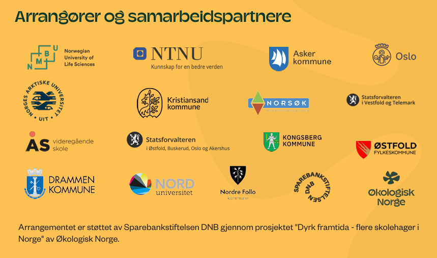 Nedenfor finner du arrangører og samarbeidspartnere fra hele landet som gikk sammen om å arrangere Norges første nasjonale skolehagekonferanse. Les mer om konferansen her: Nasjonal skolehagekonferanse 2025.