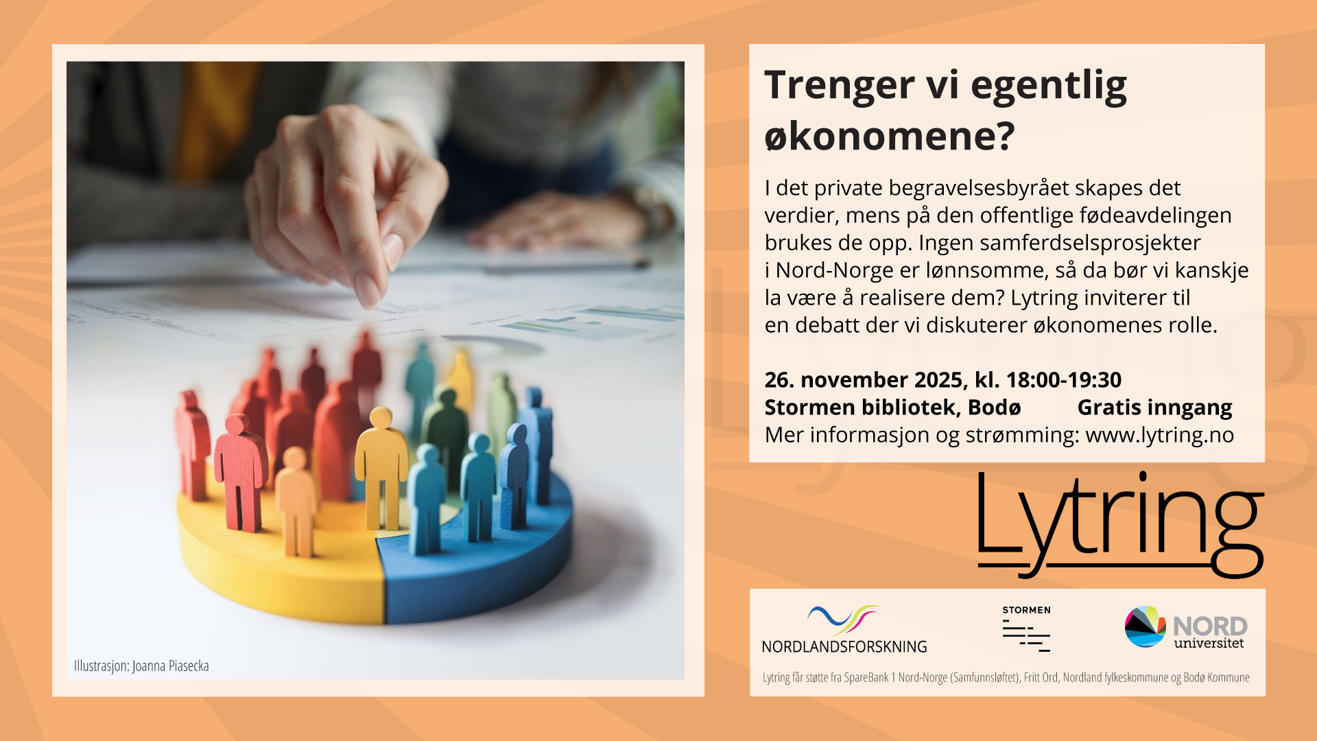 I det private begravelsesbyrået skapes det verdier, mens på den offentlige fødeavdelingen brukes de opp. Ingen samferdselsprosjekter i Nord-Norge er lønnsomme, så da bør vi kanskje la være å realisere dem? Lytring inviterer til en debatt der vi diskuterer økonomenes rolle.