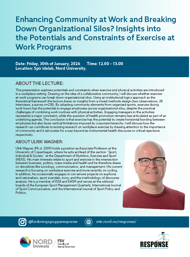 This presentation explores potentials and constraints when exercise and physical activities are introduced in a workplace setting. Drawing on the idea of a collaborative community, I will discuss whether exercise-at-work programs can break down organizational silos. Using an institutional logics approach as the theoretical framework the lecture draws on insights from a mixed methods design (two observations, 28 interviews, a survey n=238). By adopting community elements from organized sports, exercise during work hours has the potential to engage employees across organizational silos, despite the practical challenges of combining work routines with physical activities. Engaging managers in the activities represents a major constraint, while the question of health promotion remains less articulated as part of an underlying agenda. The conclusion is that exercise has the potential to create horizontal bonding between employees but also faces vertical limitations imposed by corporate hierarchy. I will discuss how the research can contribute to existing research on workplace exercise by drawing attention to the importance of community and it advocates for a way beyond an instrumental health discourse or critical rejections respectively.