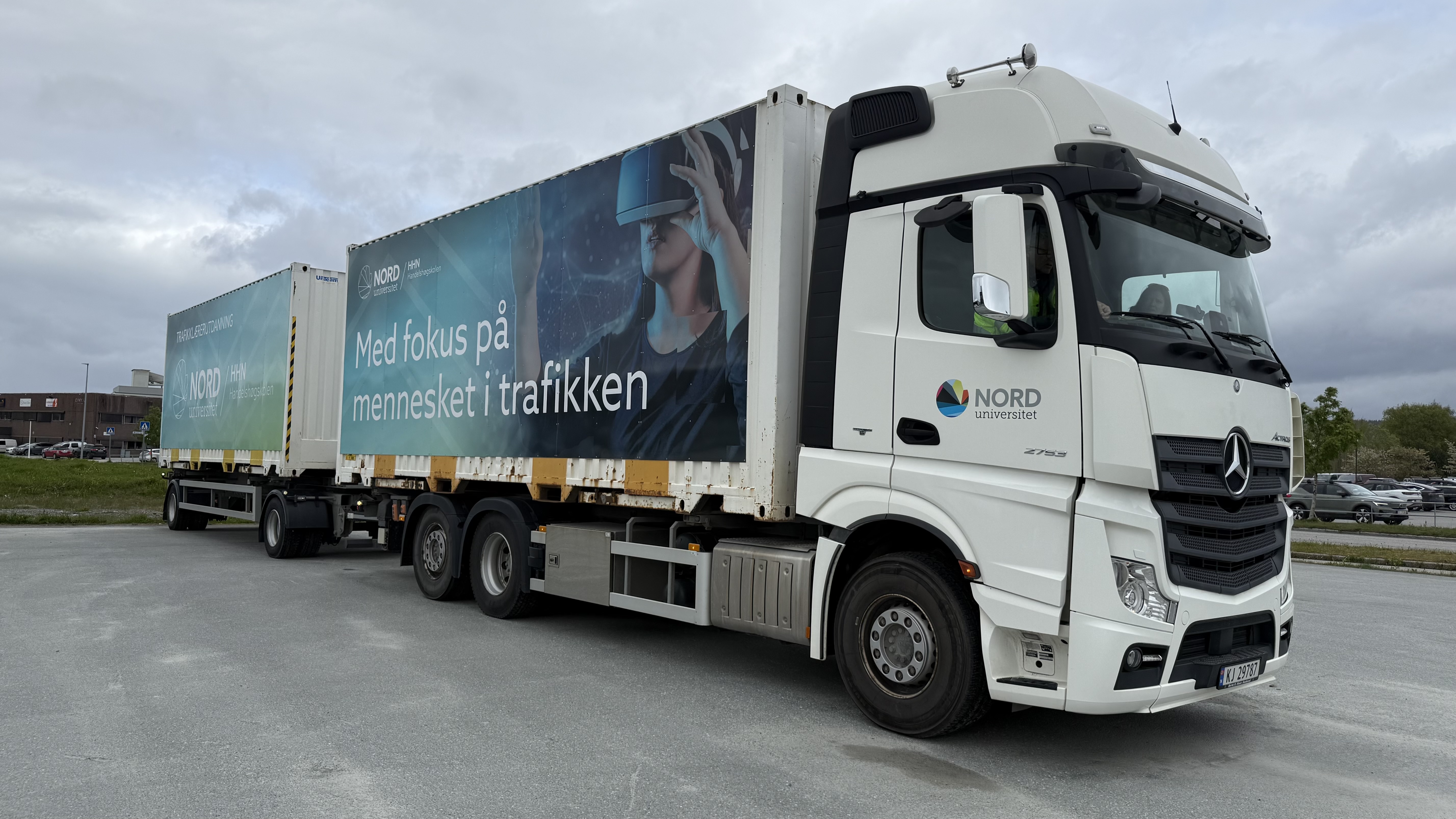 The truck is equipped with advanced driver assistance systems, including adaptive cruise control, lane keeping assist, and a fourth-generation active brake assist. Its container frame, sourced from Ulefoss, supports 24- and 25-foot containers and includes a 2-ton Zepro tail lift. The Actros is a versatile platform for research in vehicle automation, logistics optimization, and safety technologies.