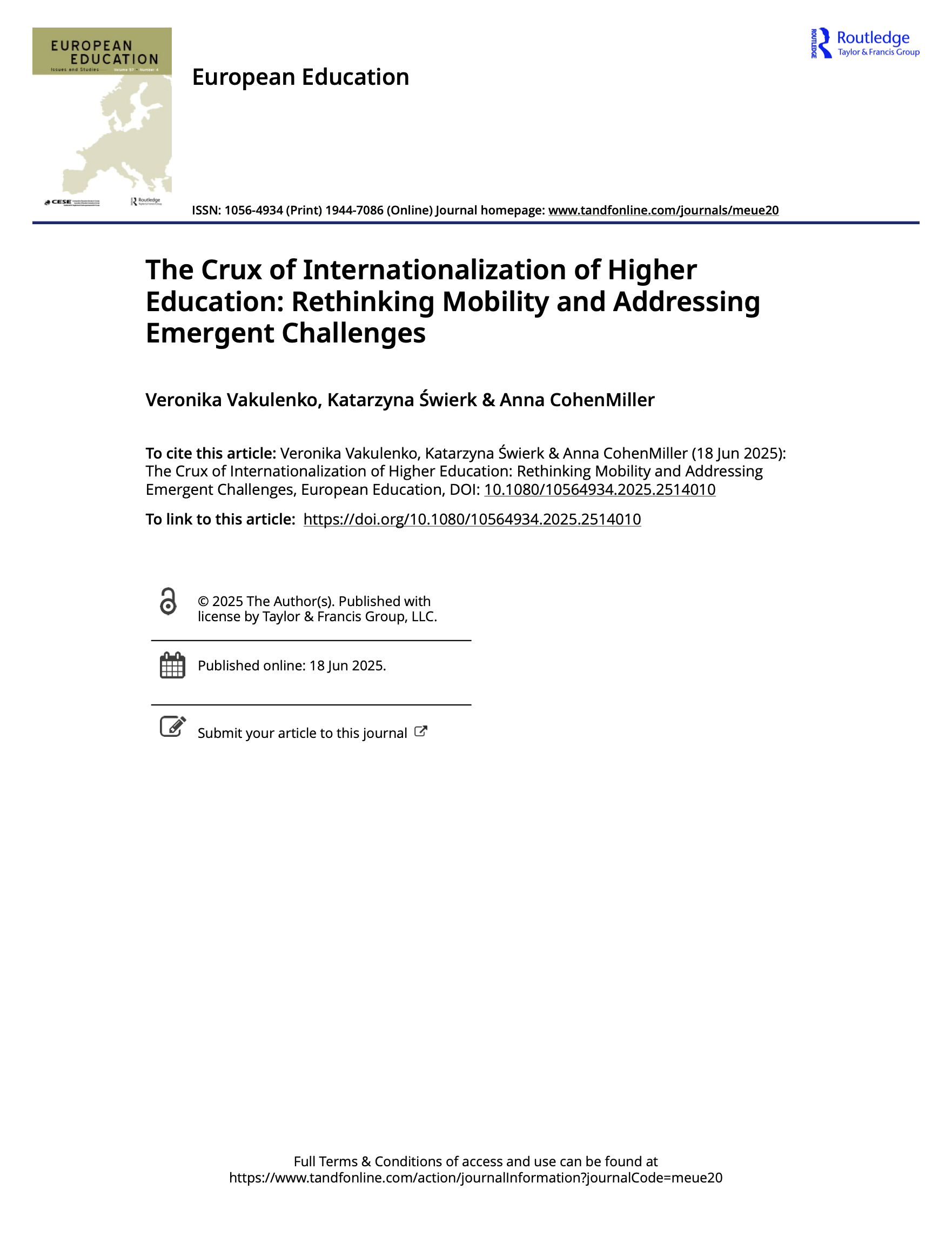 Vakulenko, V., Świerk, K., & CohenMiller, A. (2025). The Crux of Internationalization of Higher Education: Rethinking Mobility and Addressing Emergent Challenges. European Education, 1–15. https://doi.org/10.1080/10564934.2025.2514010